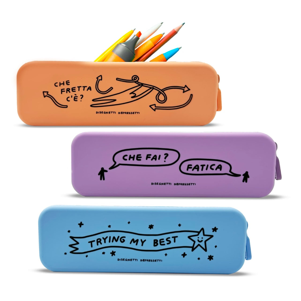 Gli astucci One Color Disegnetti Depressetti, nati dalla collaborazione con l’illustratrice Elisa Shori, sono realizzati in silicone (18,5×12,5×2,4 cm) con stampa serigrafica e logo a rilievo. Non solo funzionali, ma autentici capolavori da collezionare, uniscono arte e praticità per rendere ogni giorno unico.