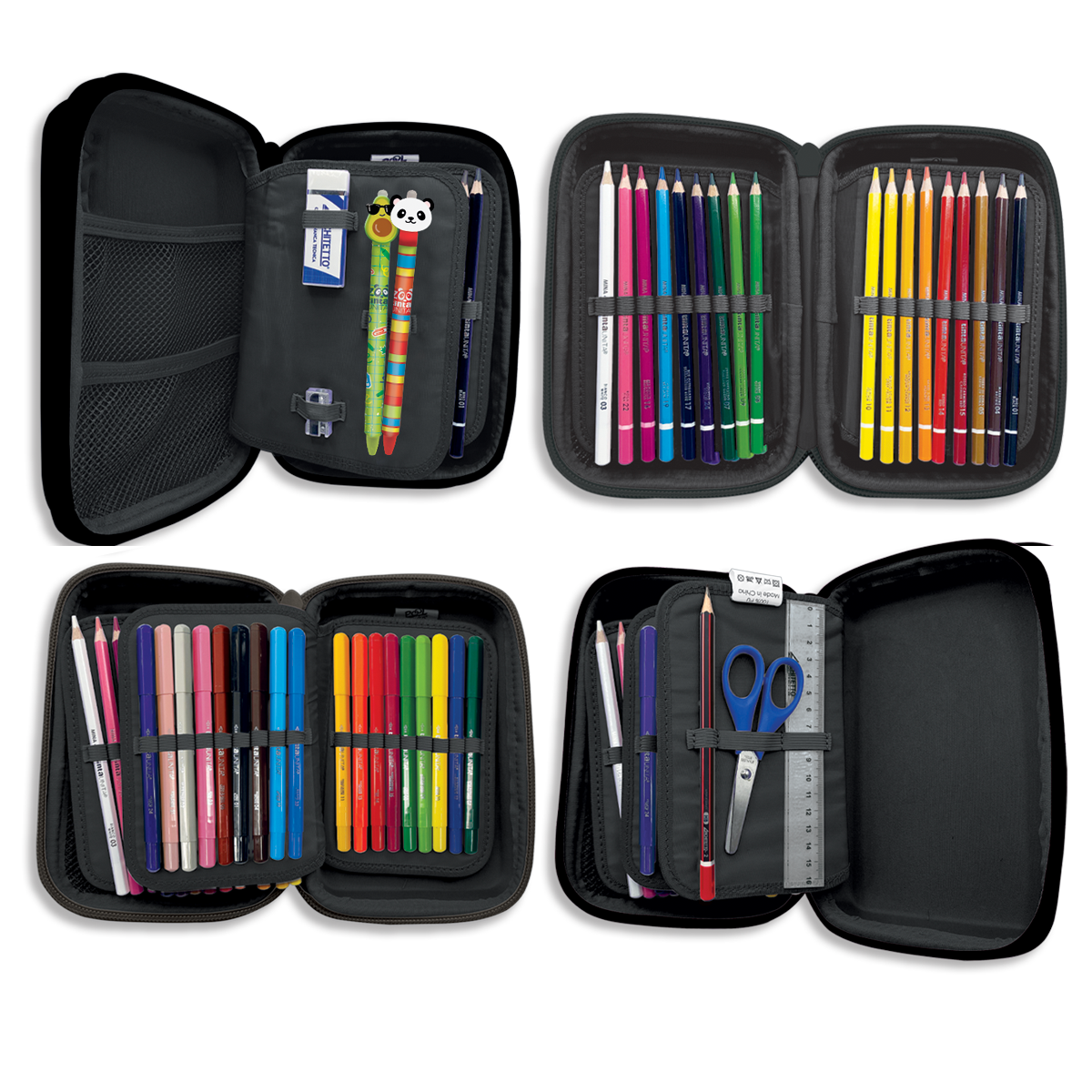 astuccio accessoriato con 2 penne cancelline, 18 pastelli 4.2, 18 pennarelli, 1 matita hb, 1 gomma, 1 temperino 1 foro, 1 paio di forbici e 1 righello 16 cm.