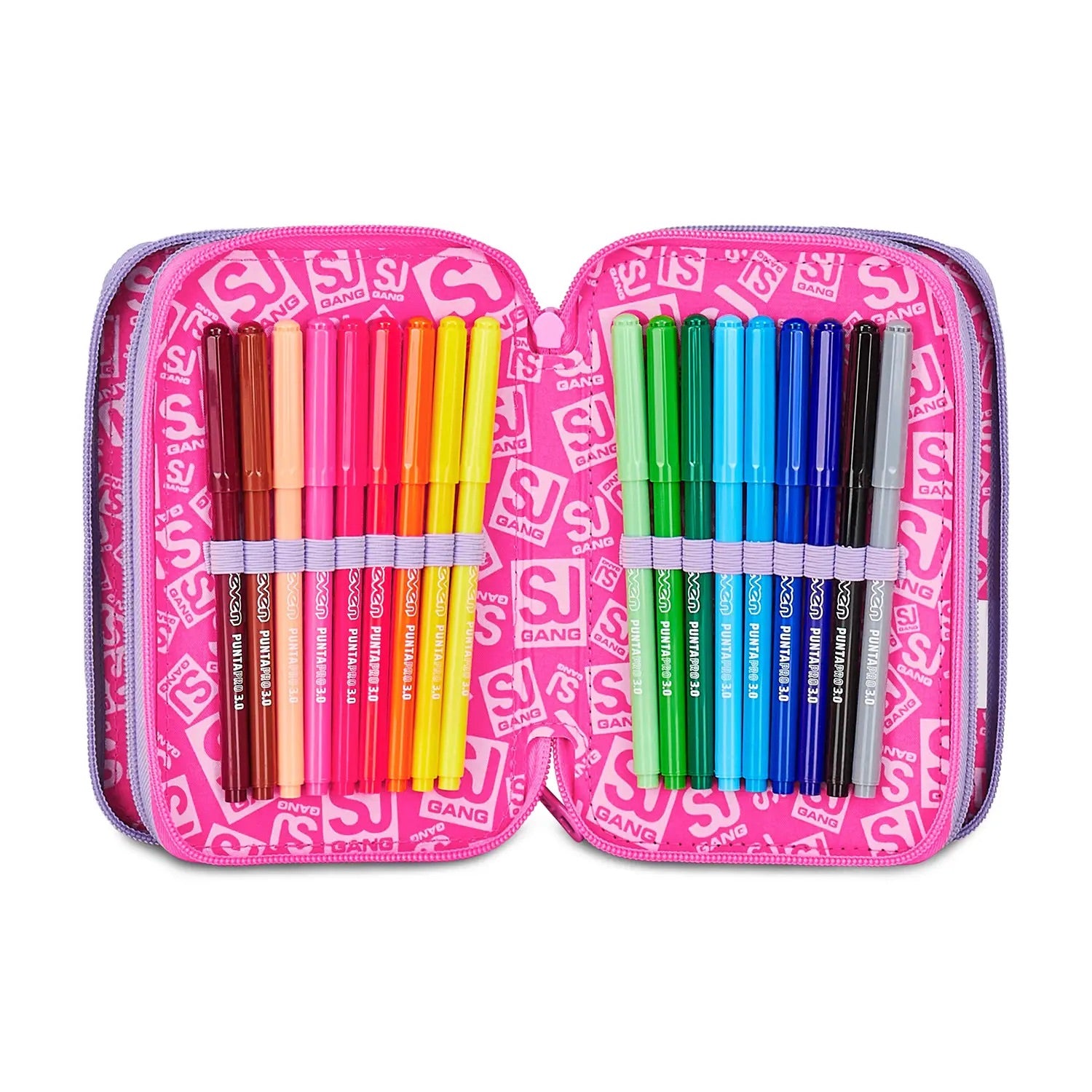 Ciao! Sono il coloratissimo Astuccio 3 zip SJ Gang. Dotato di 3 scomparti completi di tutto il materiale necessario per fare al meglio i tuoi lavori di scuola, puoi abbinarmi a uno zaino o a un trolley SJ Gang.