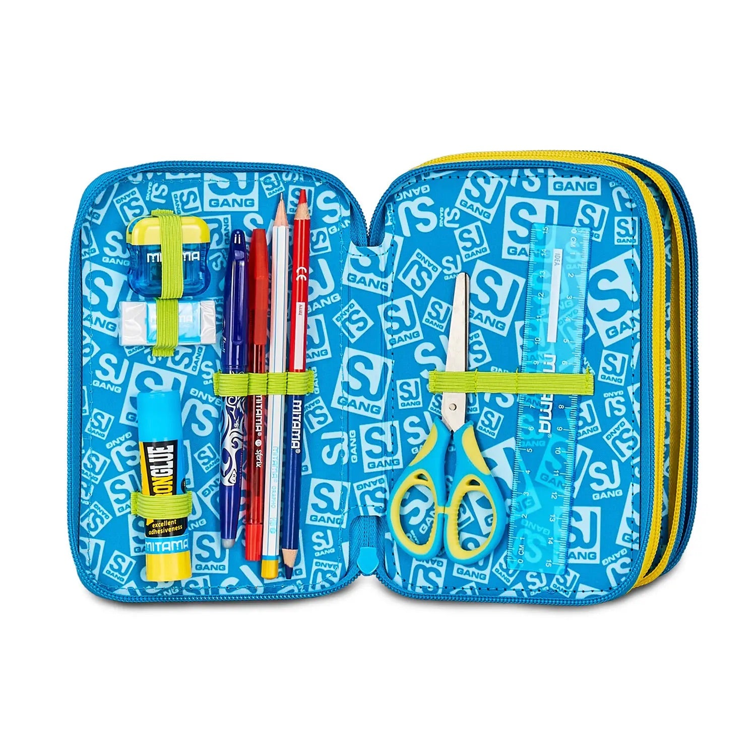 Ciao! Sono il coloratissimo Astuccio 3 zip SJ Gang. Dotato di 3 scomparti completi di tutto il materiale necessario per fare al meglio i tuoi lavori di scuola, puoi abbinarmi a uno zaino o a un trolley SJ Gang.