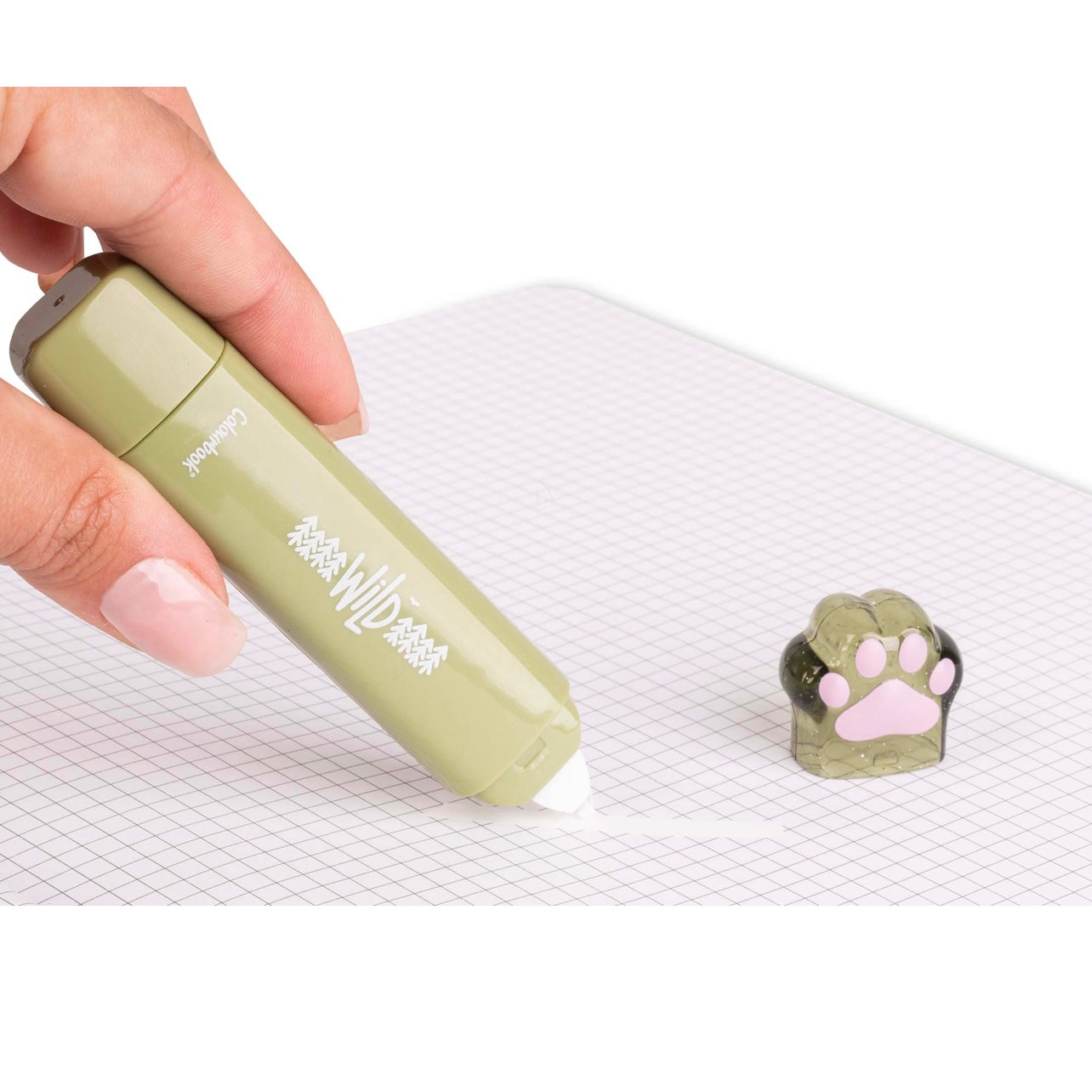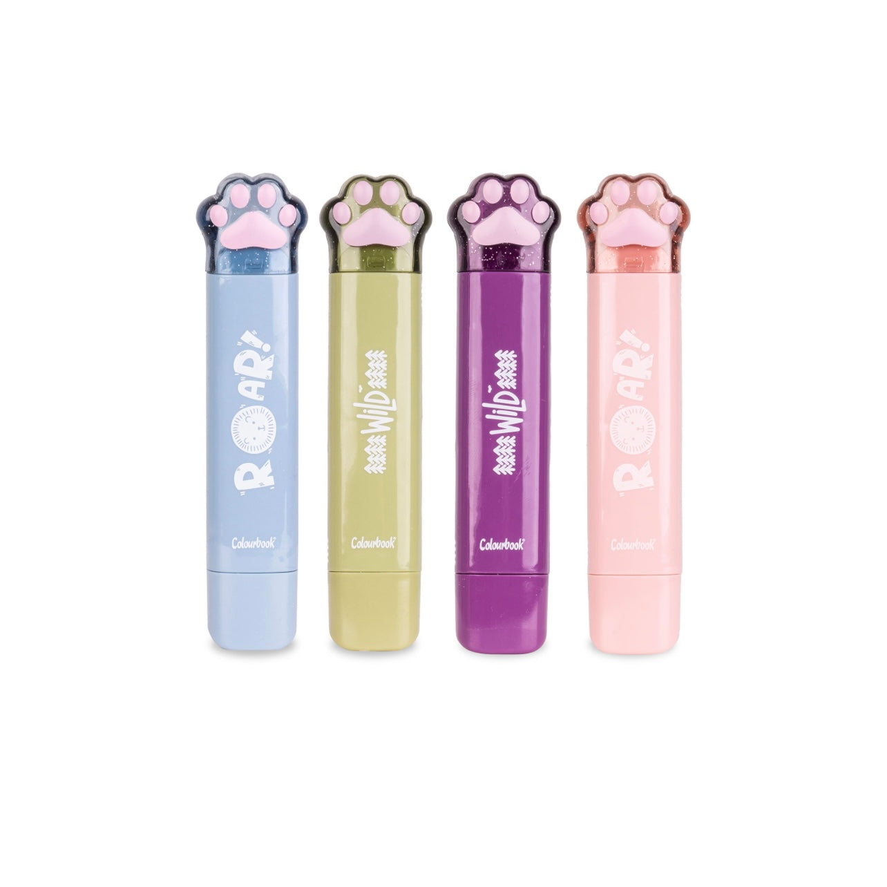 Da un lato un correttore a nastro, dall’altro una testina che rilascia una striscia di colla: il tutto racchiuso in due coloratissime zampette glitterate.
