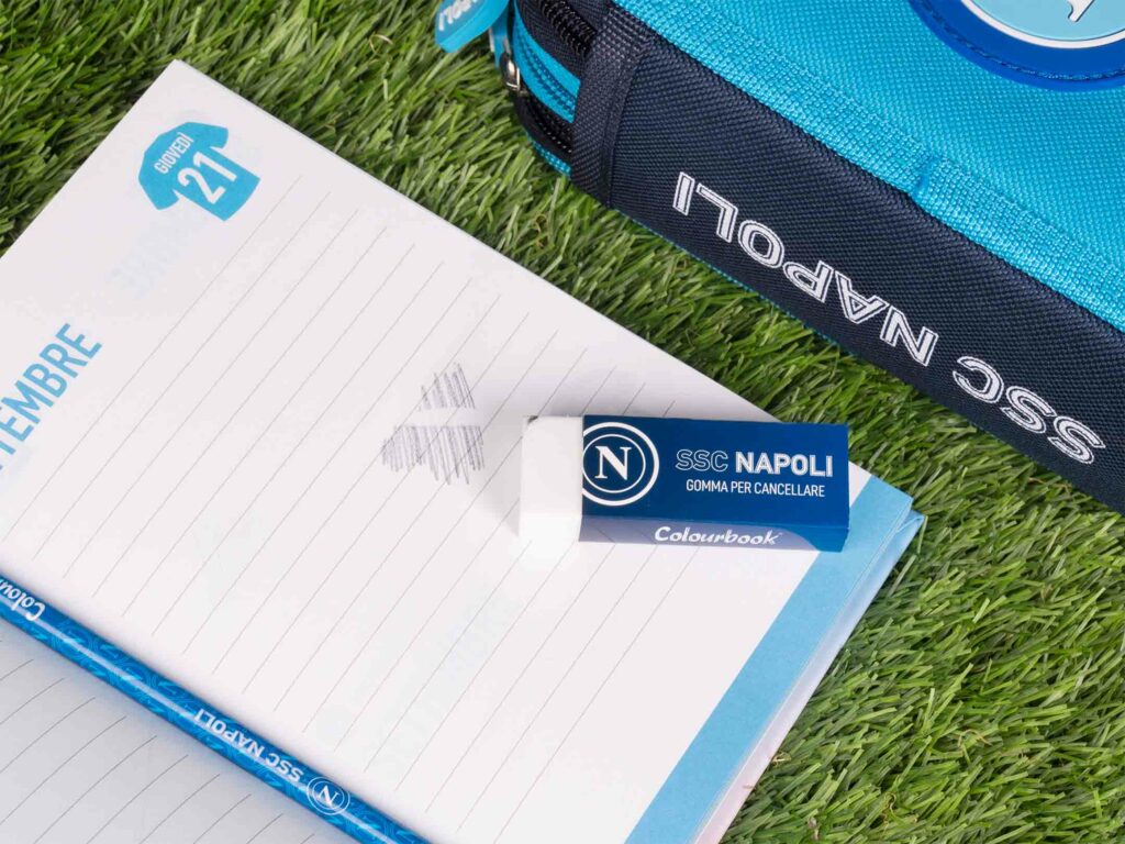 Ma la vera chicca di questa gomma è il suo design: il colore è ispirato al Calcio Napoli, e il logo ufficiale SSC Napoli è stampato sul cartoncino che la ricopre.