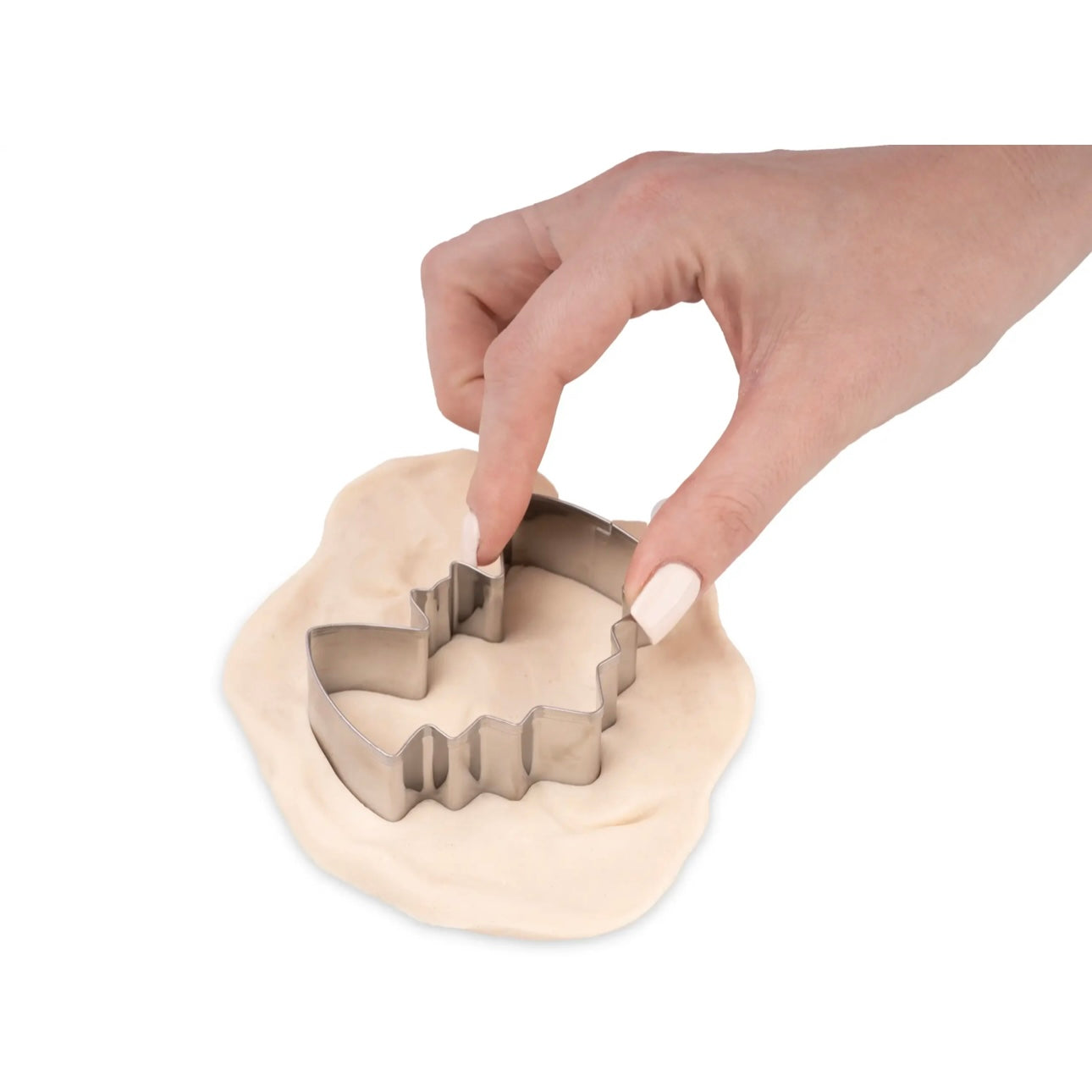 5 formine in acciaio inox per alimenti: pipistrello, zucca, cappello da strega, gatto e scopa. Perfette per biscotti a tema o lavoretti creativi. Facili da usare, sicure e lavabili.