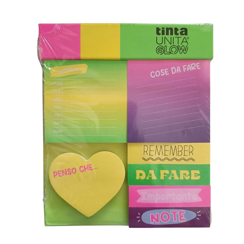 Il Kit Memo Tag Tinta Unita Glow Spring è pensato per aiutarti a gestire al meglio i tuoi impegni quotidiani. Questo set comprende: 2 blocchi quadrati attacca e stacca, perfetti per annotare promemoria importanti. 1 blocco a forma di cuore attacca e stacca, ideale per messaggi speciali o note personali. 4 segnapagina adesivi con le diciture "remember", "da fare", "importante" e "note", utili per evidenziare e categorizzare le tue annotazioni. Con questo kit, prendere appunti diventa semplice e divertente, permettendoti di organizzare le tue attività in modo efficace e colorato.