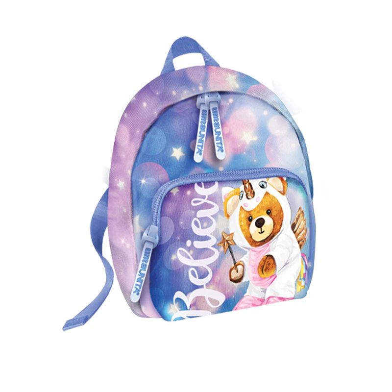 Zainetto con due tasche con chiusura a zip, in poliestere stampato e tirazip personalizzato con logo in microiniezione.