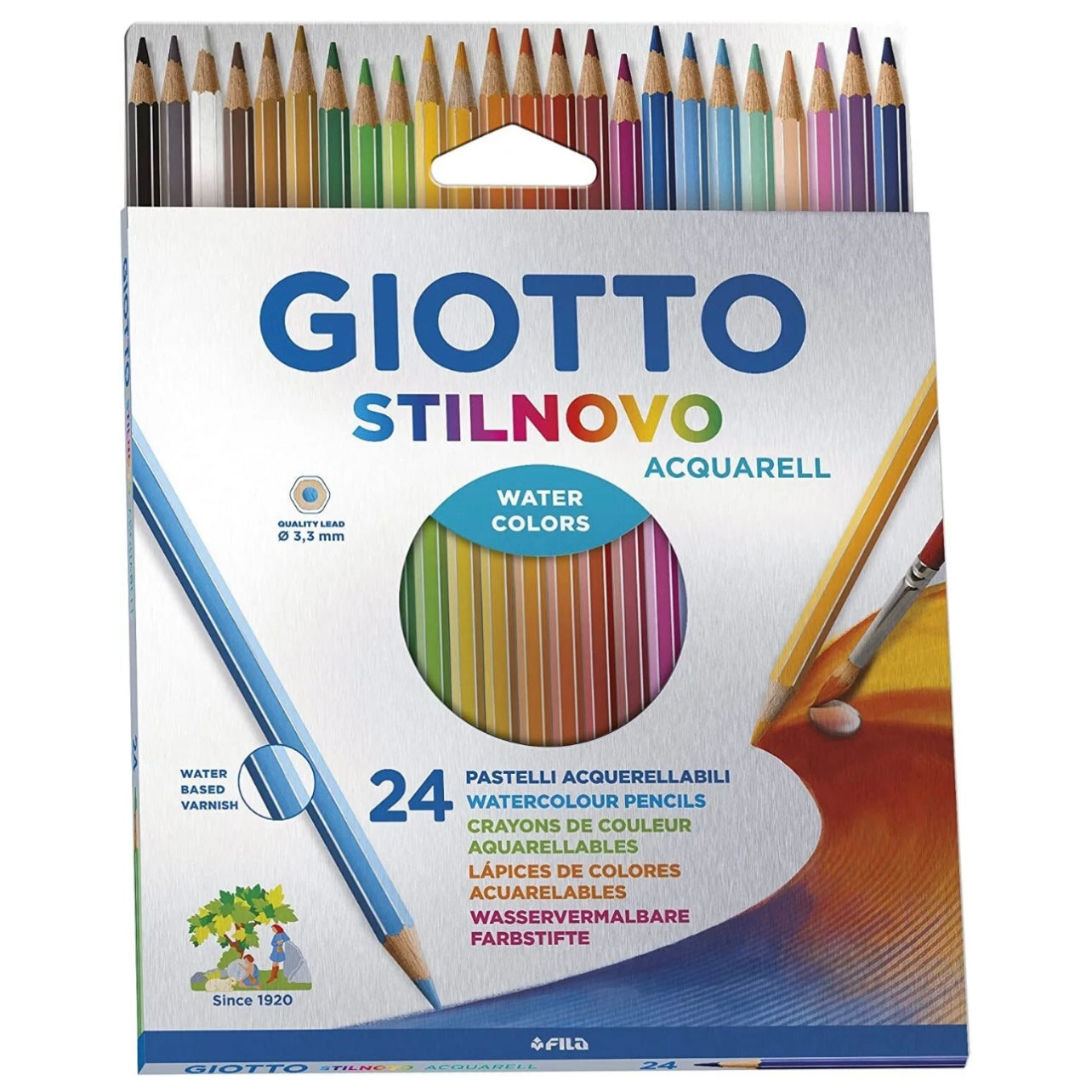 Una volta completato il disegno, è sufficiente passare un pennello bagnato sul alcuni elementi del disegno e il colore si scioglierà all’istante creando l’effetto acquerello con risultati davvero sorprendenti. La mina super resistente acquerellabile ha diametro 3,3 mm ed è disponibile in 36 varianti colore. Ogni matita è realizzata in legno certificato.