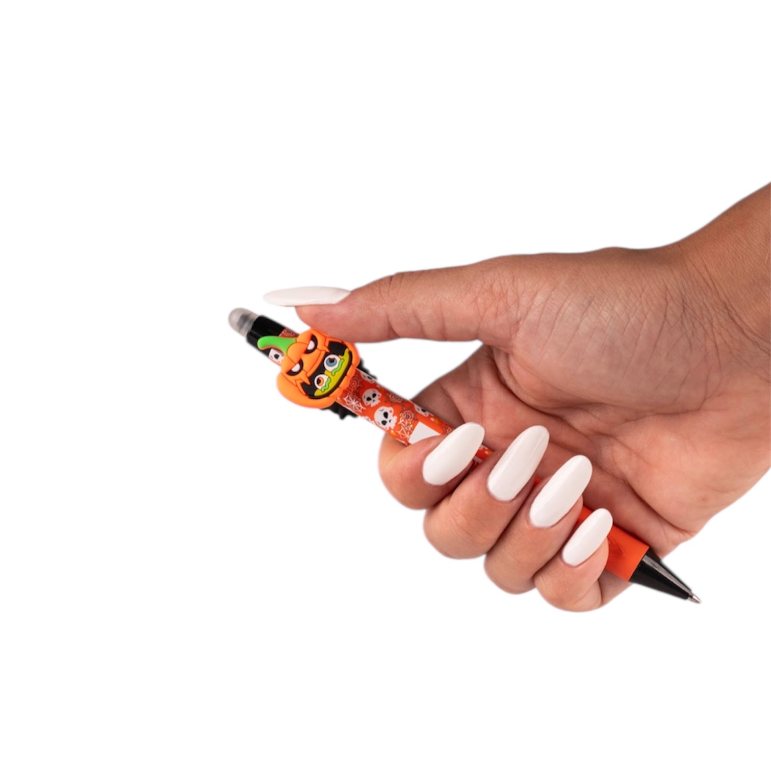 Una collezione tematica in cui il design Colourbook si unisce all’atmosfera divertente e incantata della festa più spettrale dell’anno. Penna cancellabile con topper rotante a 360°, disponibile in due varianti grafiche a tema Halloween. Dotata di inchiostro blu cancellabile e gomma a semisfera integrata, è un accessorio pratico e originale per la stagione autunnale.