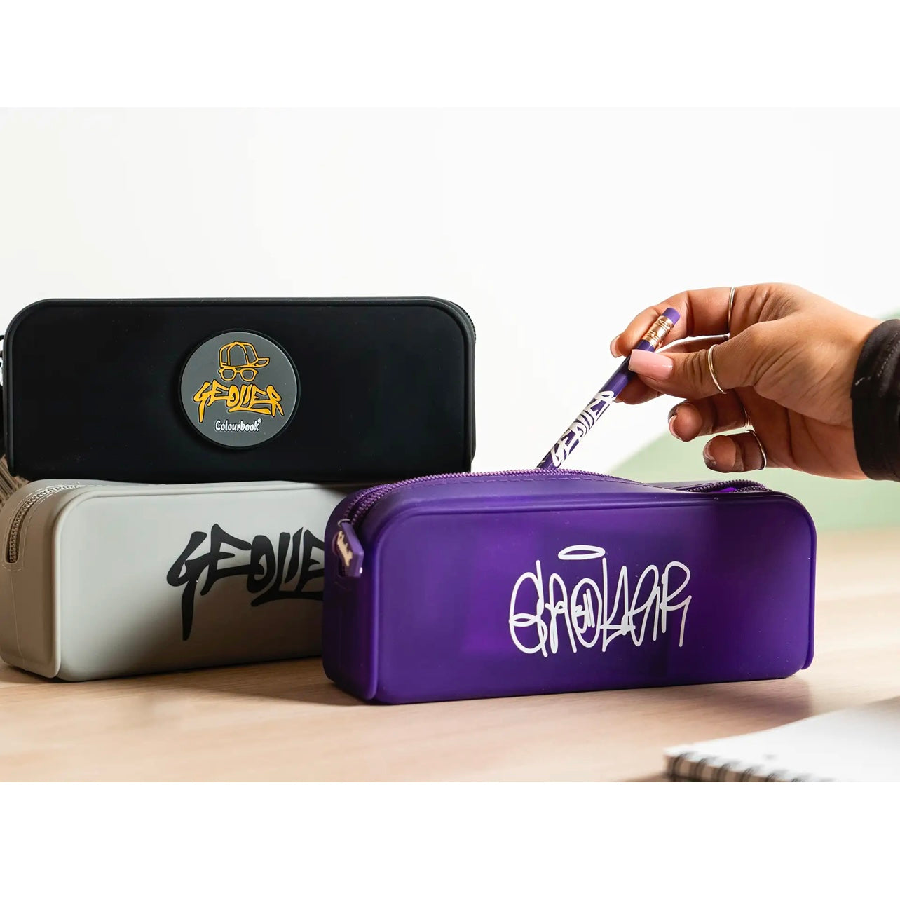 L'astuccio portapenne in silicone della linea Geolier x Colourbook si adatta perfettamente allo spazio libero nel tuo zaino; è morbido ma non perde di capienza, riesce a contenere tanta cancelleria e minuteria.
