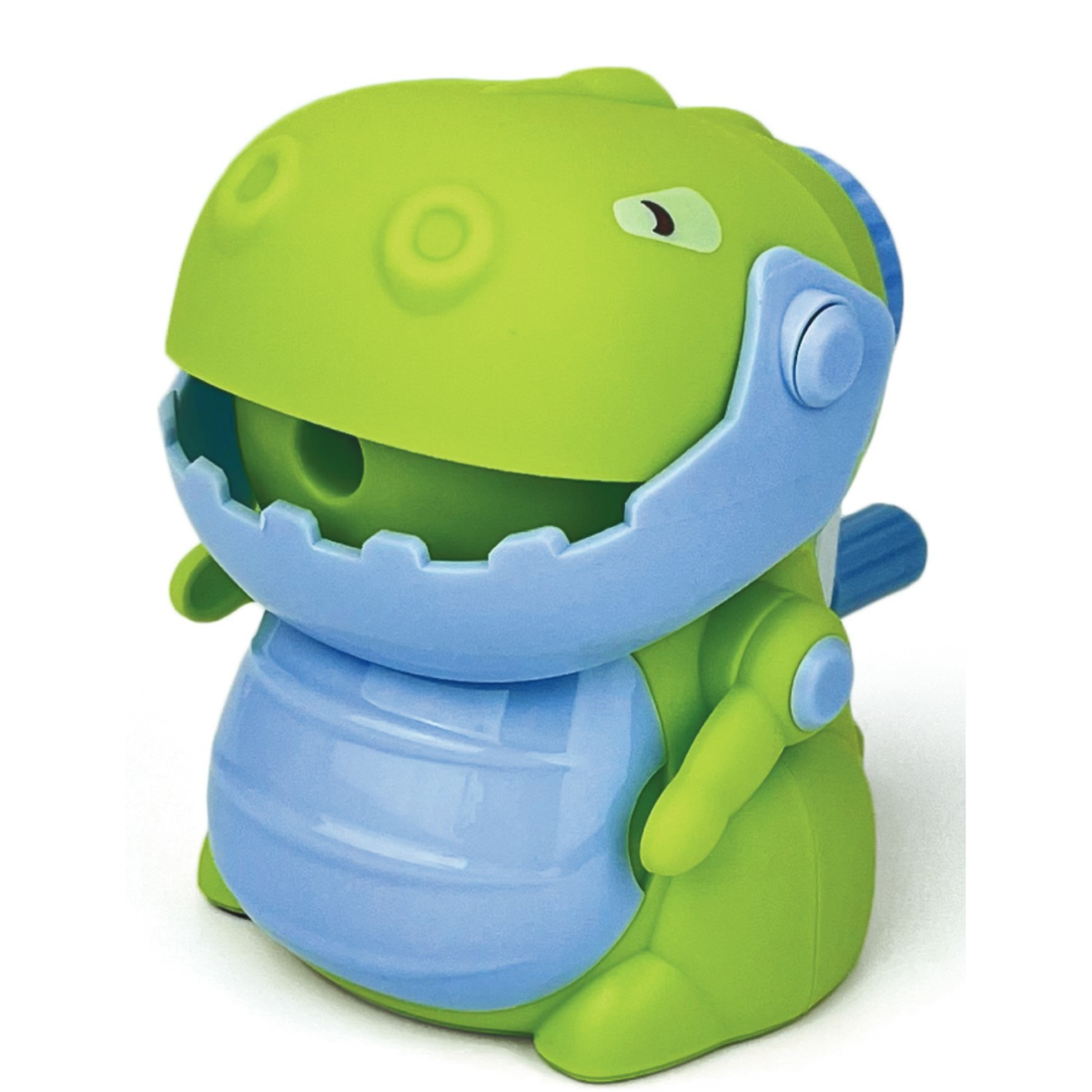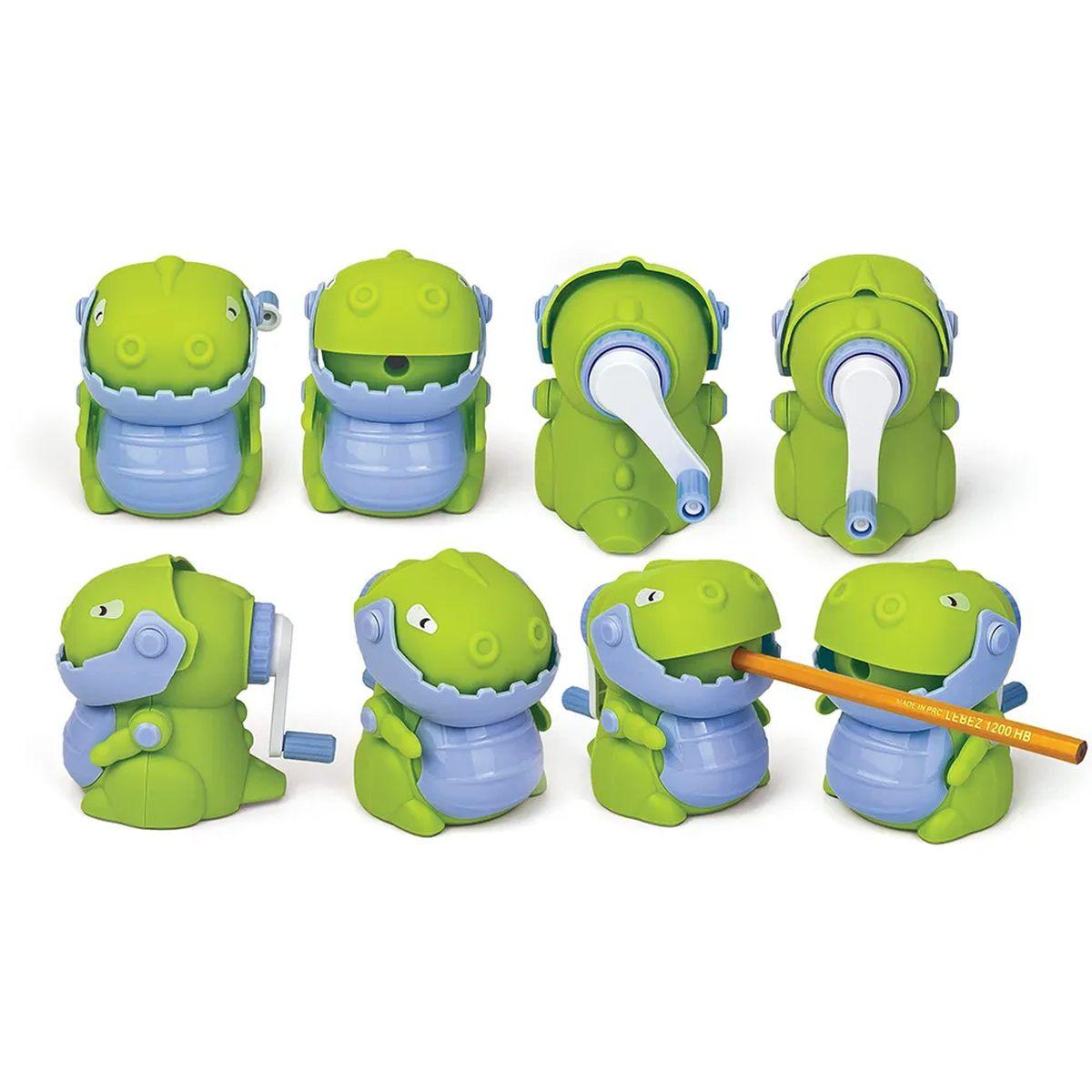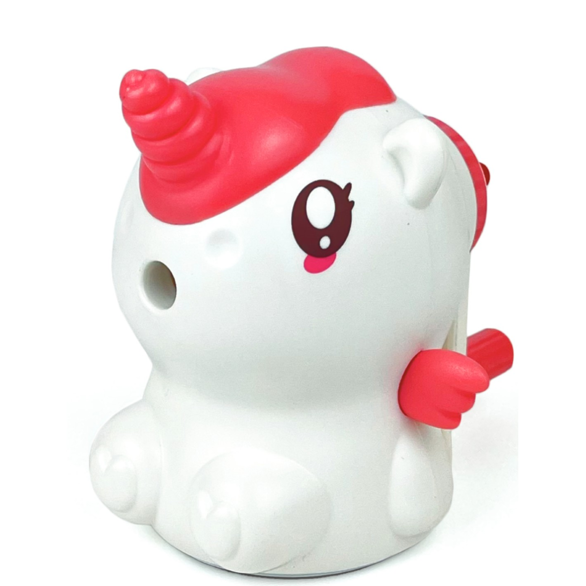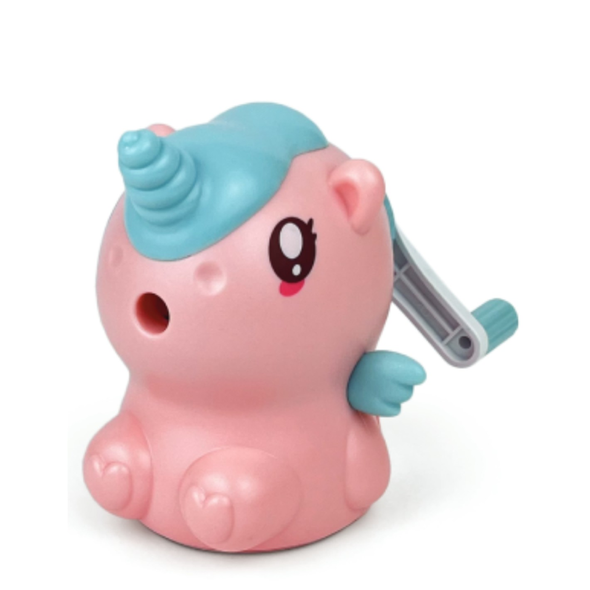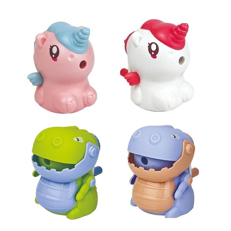 Espositore da banco contenente 8 temperamatite da scrivania “Riccioli” con fantasie Unicorno & Dino.Confezionati in pratica scatola trasparente.