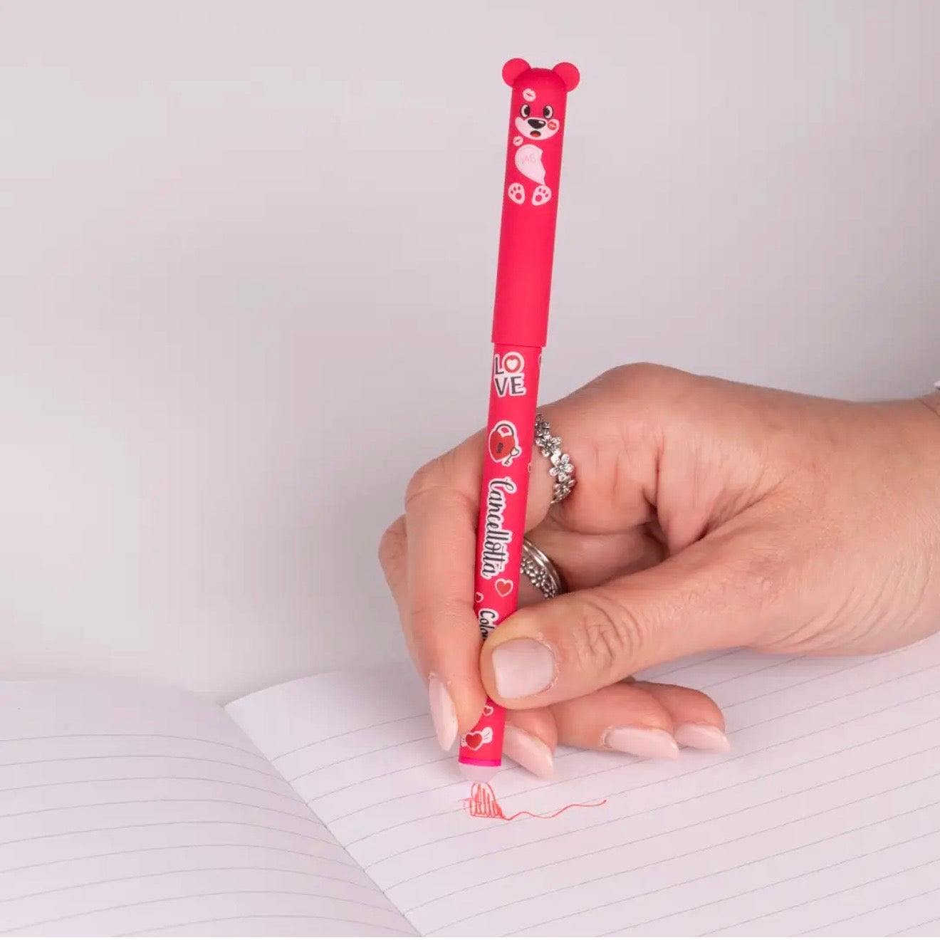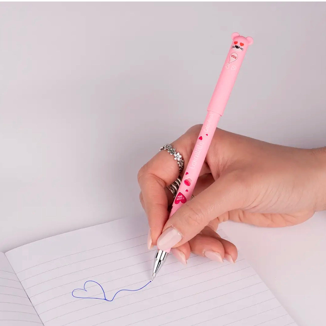 Due penne cancellabili irresistibili: lui con il classico inchiostro blu, lei con il nuovissimo inchiostro rosa. La punta da 0,7 mm garantisce una scrittura precisa e scorrevole, mentre l’anello colorato sul fusto indica la tonalità dell’inchiostro, rendendo ogni penna immediatamente riconoscibile.