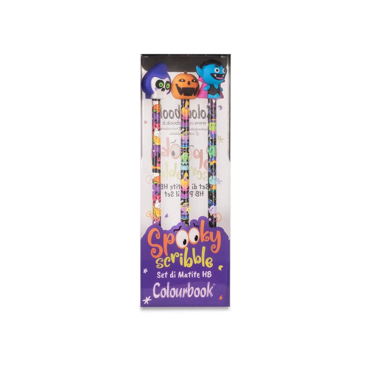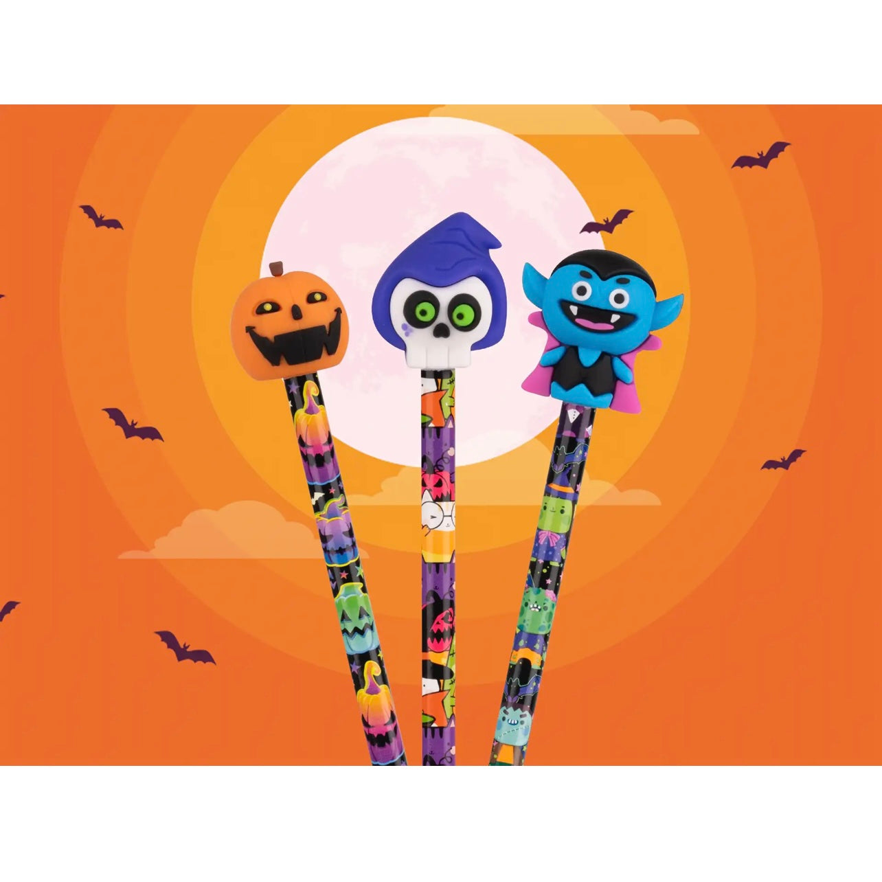 Sulla cima di ogni matita è presente un topper in gomma a tema Halloween: la zucca, Dracula e il teschio.