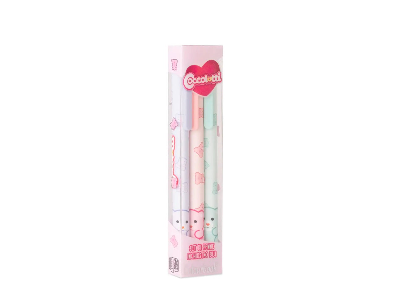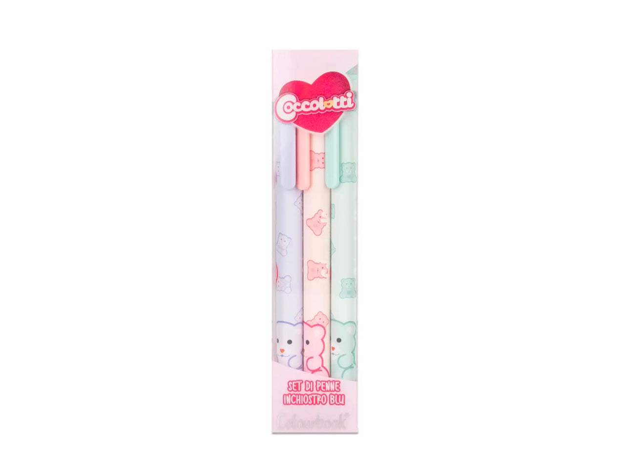 Scrivi i tuoi pensieri più dolci con il set di 3 penne a sfera con chiusura a scatto Coccolotti by Colourbook. 3 penne della collezione Coccolotti Classic con le iconiche grafiche dei celebri orsetti. Le penne sono tutte con inchiostro blu.