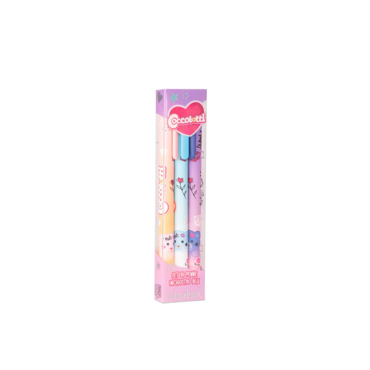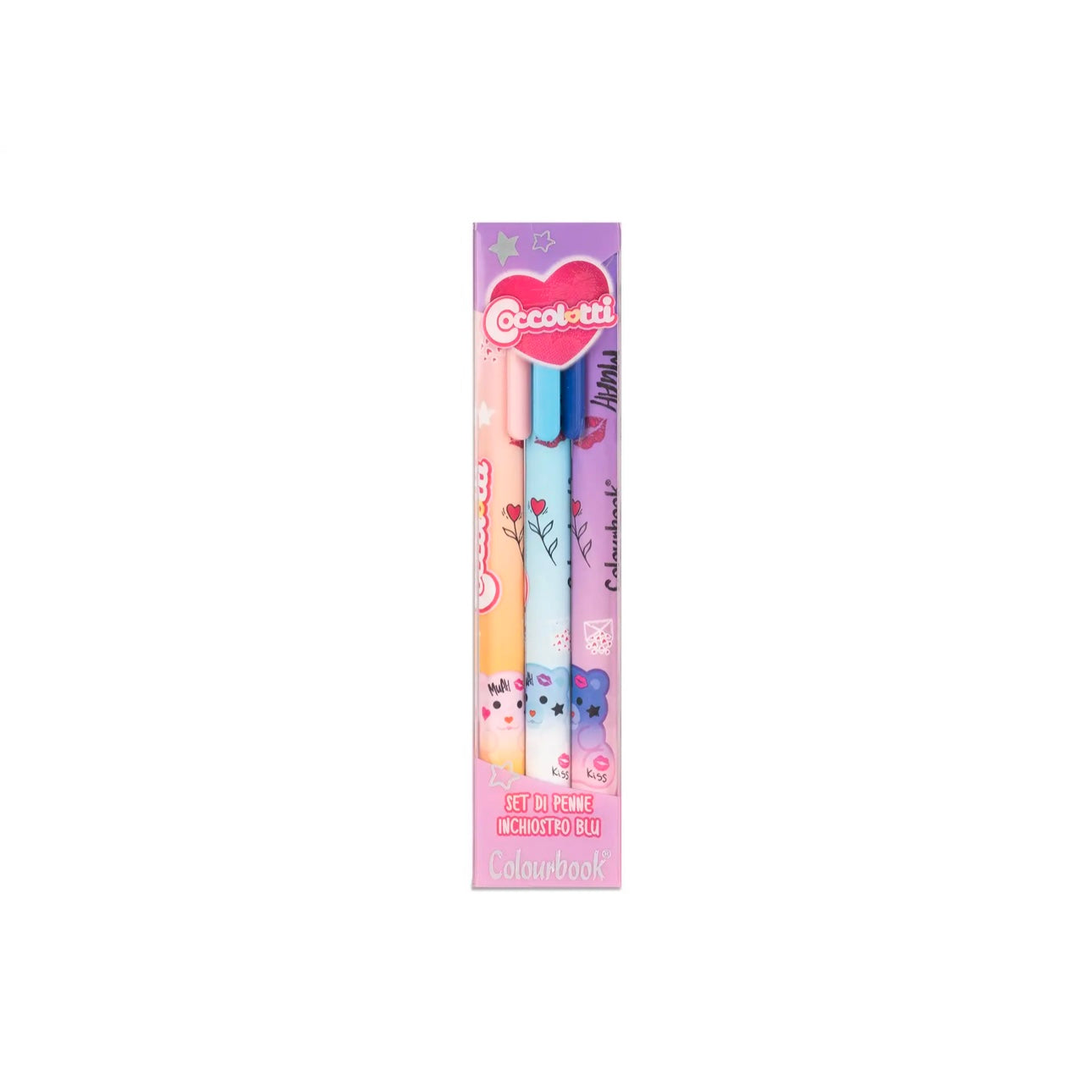 Scrivi i tuoi pensieri più dolci con il set di 3 penne a sfera con chiusura a scatto Coccolotti by Colourbook. 3 penne della collezione Coccolotti Love&Tell con le iconiche grafiche dei celebri orsetti. Le penne sono tutte con inchiostro blu.