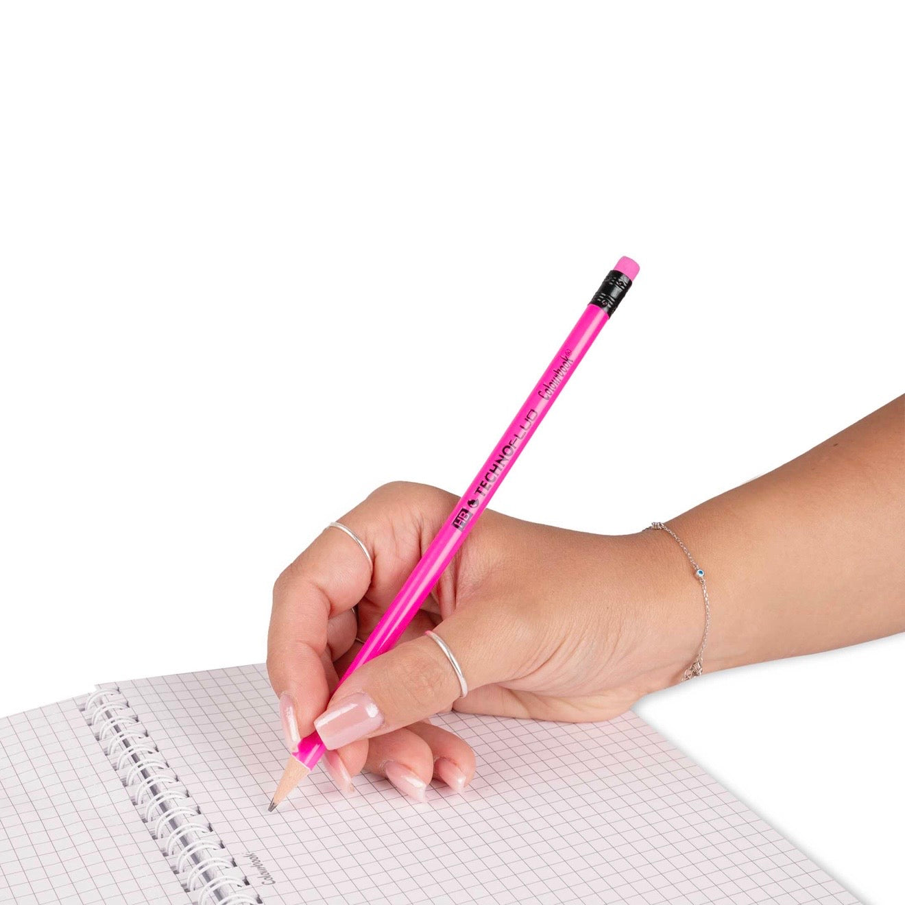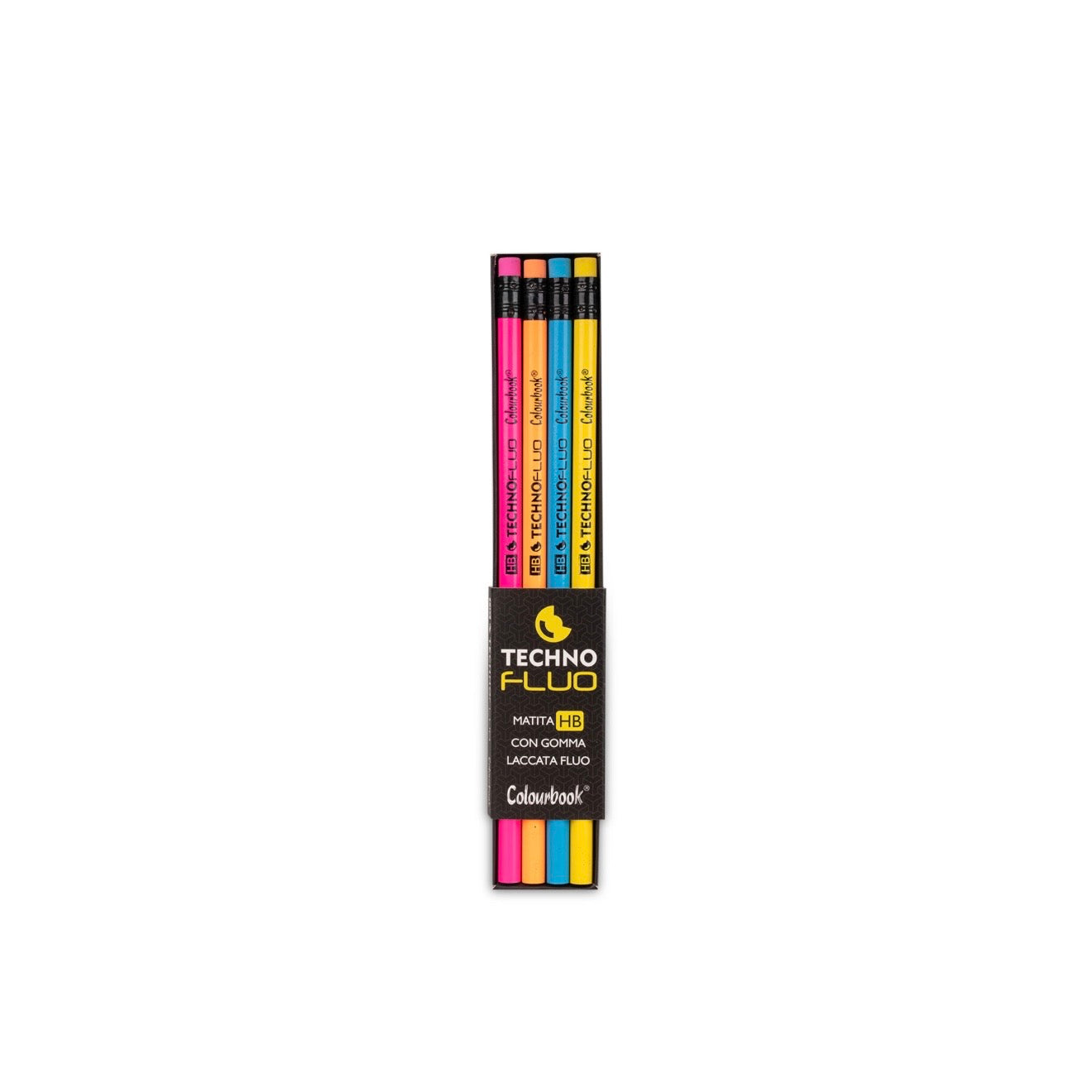 Set di matite HB in blister da quattro. Scarabocchia, disegna e dai spazio ai tuoi pensieri con il set techno fluo, matite coloratissime indispensabili nel tuo astuccio. Con le techno fluo disegna e annota senza pensieri, la mina in grafite HB è super resistente! Ogni matita ha la gomma in tinta.