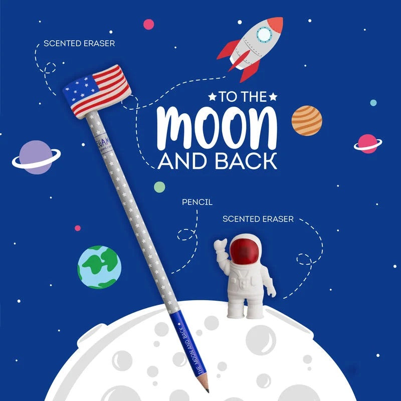 To the Moon and Back di Legami è il set da scrivania composto da una matita e due gomme dedicato a chi punta davvero in alto.