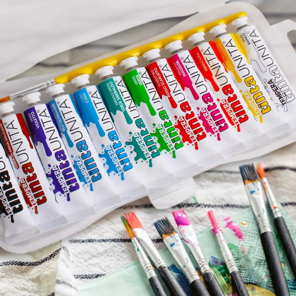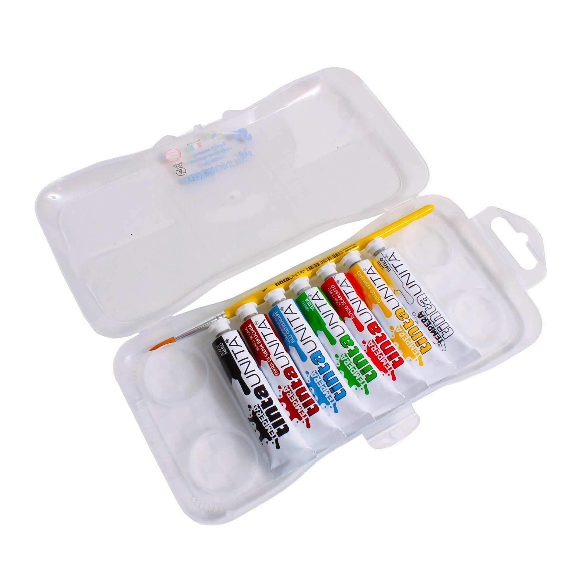 Tempere Made in Italy ultrafine in formato 12 ml. Tubetto in alluminio con tappo a chiusura vite. Facile da stendere, perfettamente omogenea, opaca e coprente è ideale per tutte le attività artistiche a scuola e a casa. Disponibile in confezioni da 7 colori primari, 7 colori assortiti in box attrezzato, con pennello.