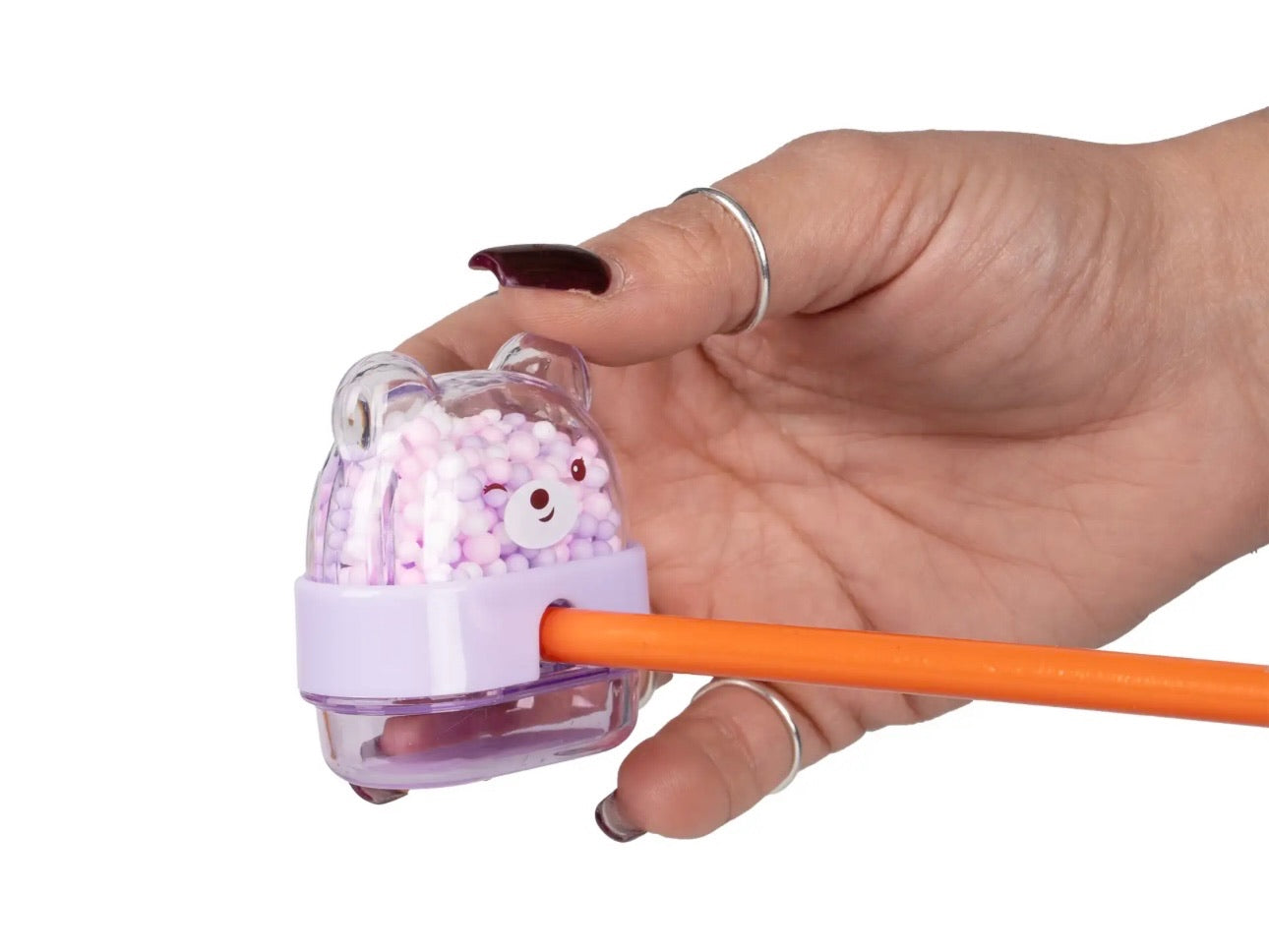 Sharpy Bear è il temperamatite con serbatoio a un foro da 3,3 mm, perfetto per avere sempre le tue matite pronte all'uso. Il design a forma di tenero orsetto lo rende irresistibile, mentre il coperchio in plastica trasparente racchiude al suo interno coloratissime palline fluttuanti in polistirolo, per un tocco di allegria ad ogni utilizzo.