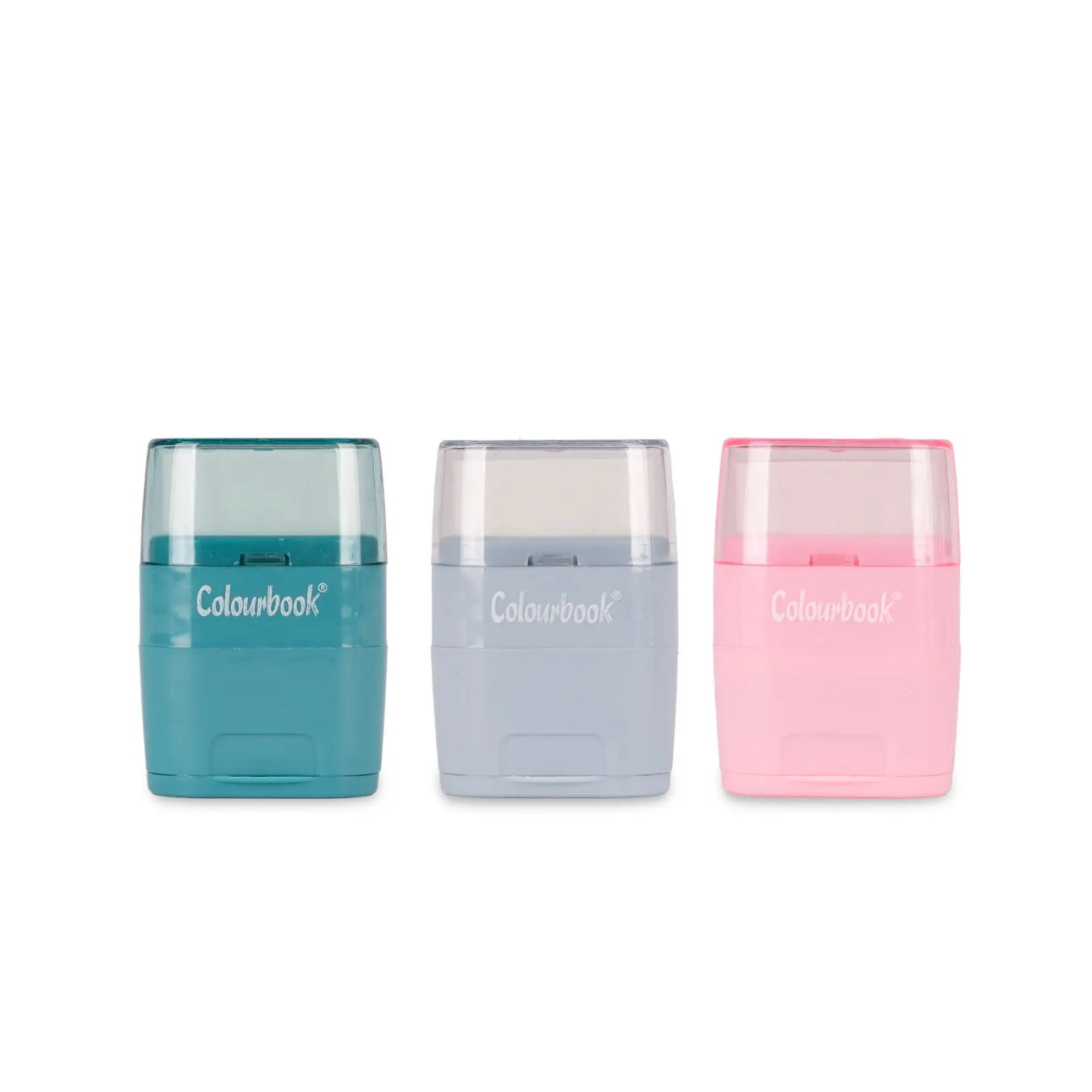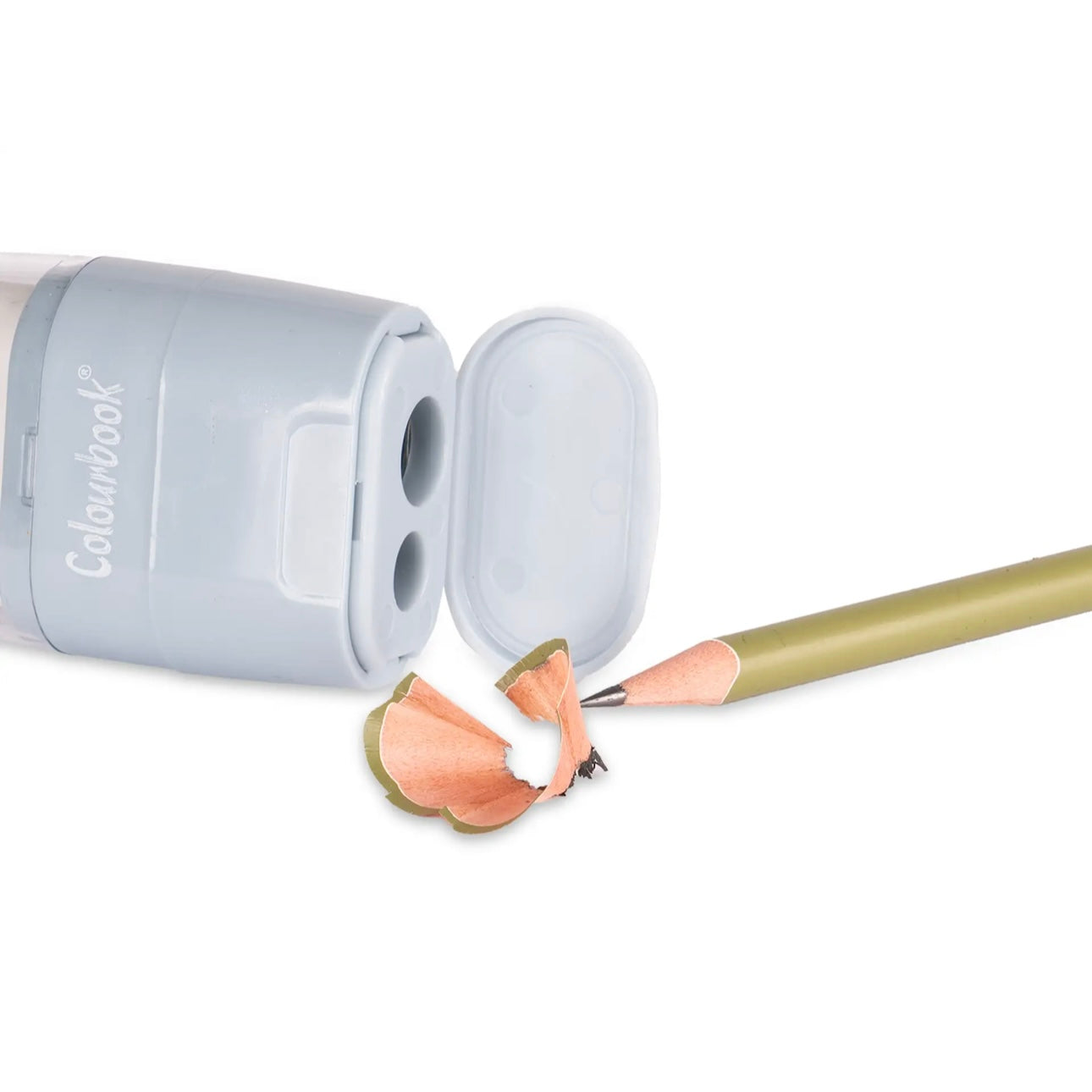 Con il temperino 2 in 1 Colourbook sei sempre pronto: doppio foro per mine standard e jumbo, serbatoio capiente e gomma extra spessa che fa sparire anche i tratti più grandi.