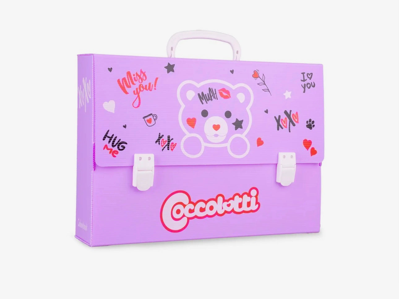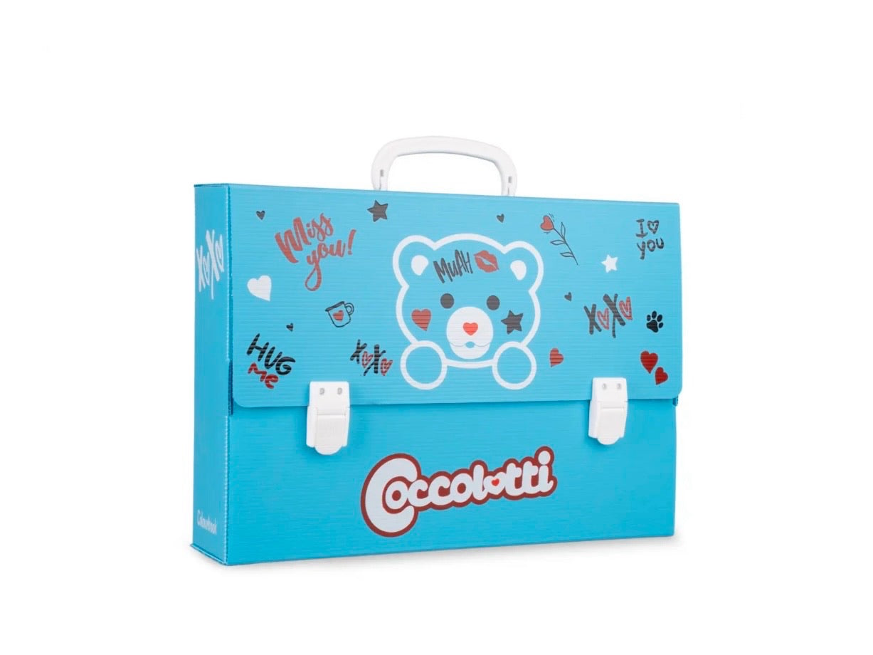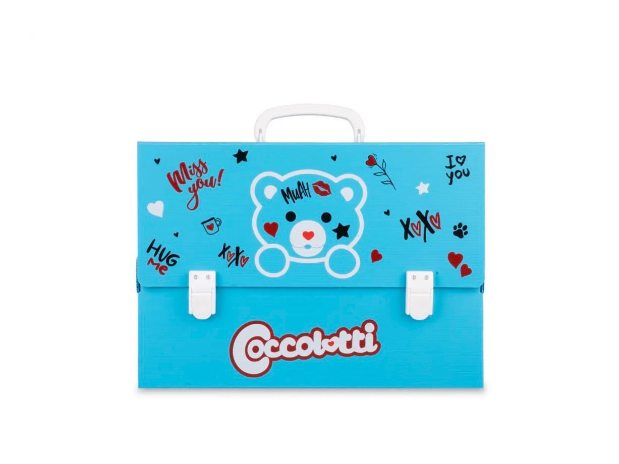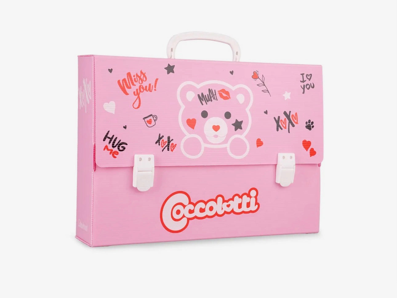La valigetta portadisegni Coccolotti by Colourbook è un concentrato di tenerezza, grazie agli orsetti della collezione Love&Tell. Con dorso da 8 cm e decorata con le grafiche iconiche dei Coccolotti, la cartella tecnica è resistente e riesce a contenere tutti i disegni dell’anno scolastico. Manico e chiusure in bianco, prodotto interamente Made in Italy e realizzato su licenza ufficiale Giochi Preziosi.