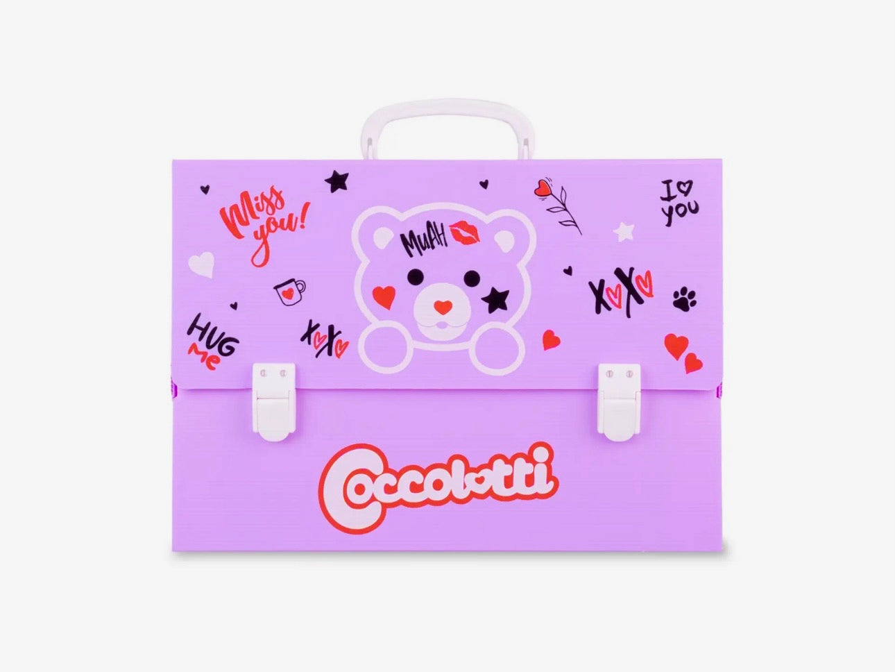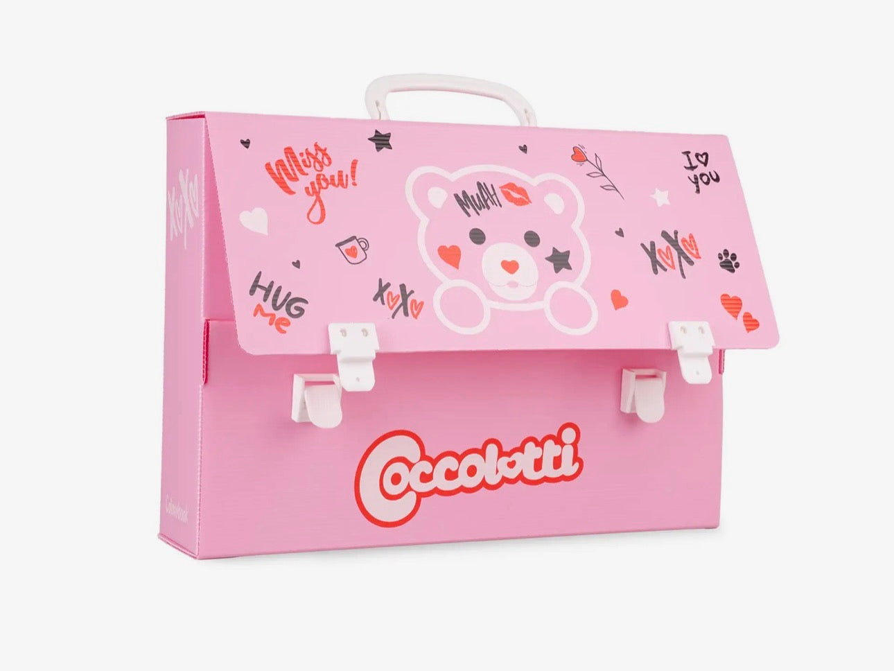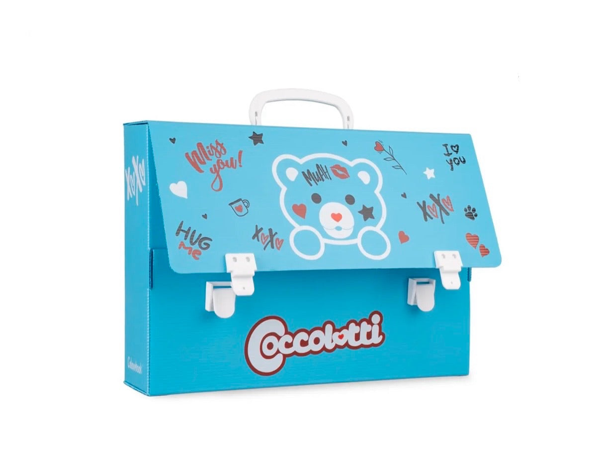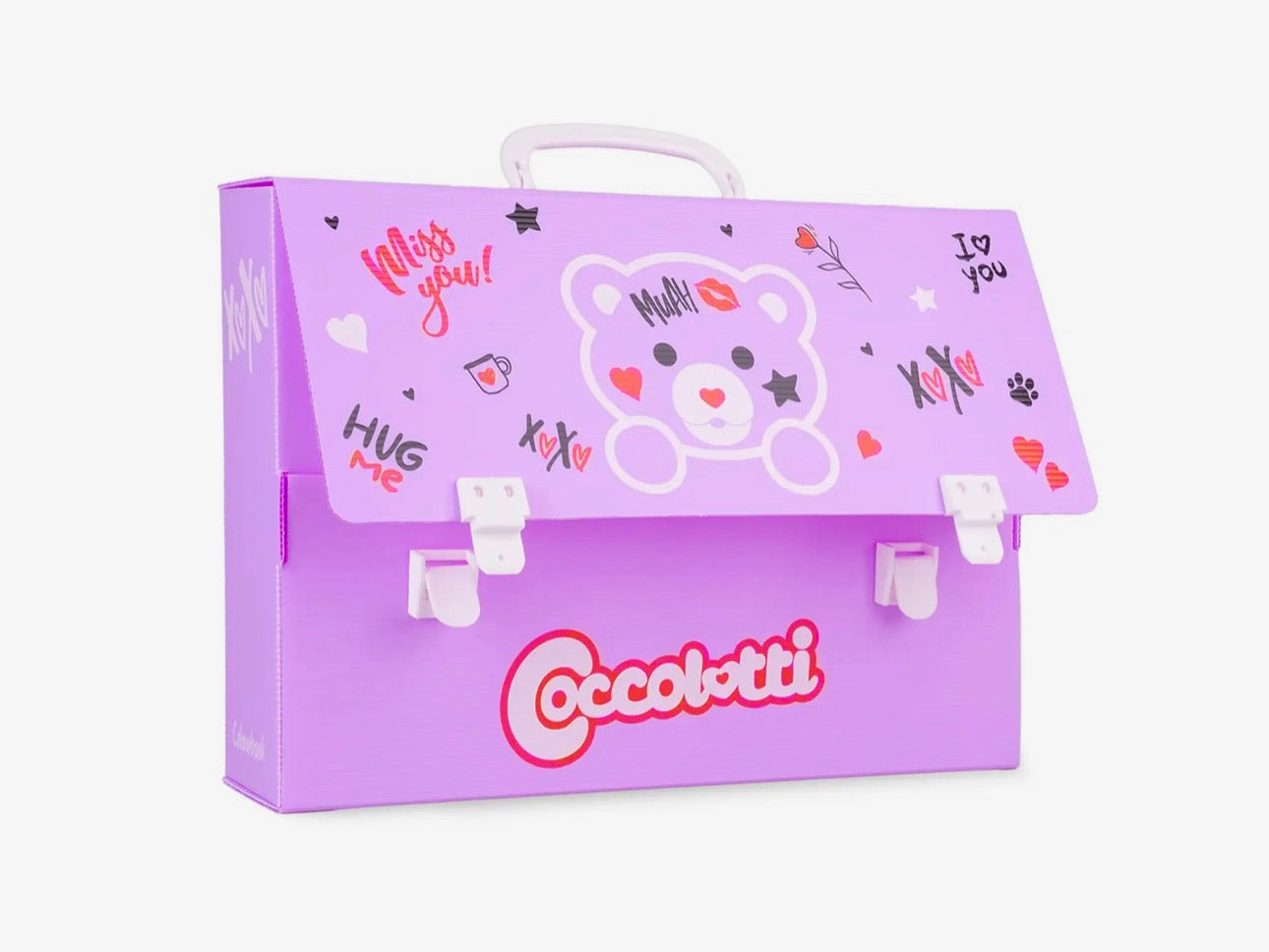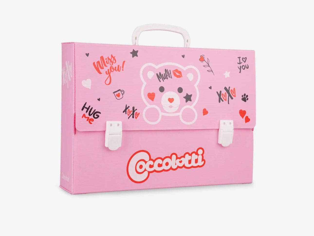 La valigetta portadisegni Coccolotti by Colourbook è un concentrato di tenerezza, grazie agli orsetti della collezione Love&Tell. Con dorso da 8 cm e decorata con le grafiche iconiche dei Coccolotti, la cartella tecnica è resistente e riesce a contenere tutti i disegni dell’anno scolastico. Manico e chiusure in bianco, prodotto interamente Made in Italy e realizzato su licenza ufficiale Giochi Preziosi.