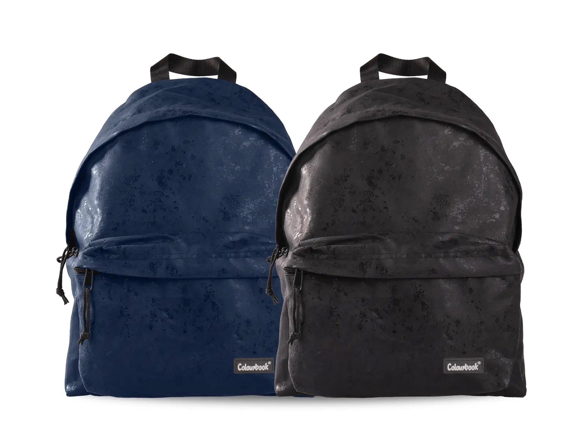 Porta stile e praticità nella tua quotidianità con lo zaino Kinetic della linea Elite in simil daino, con iridescenze metalliche a macchia blu o nero, tono su tono.